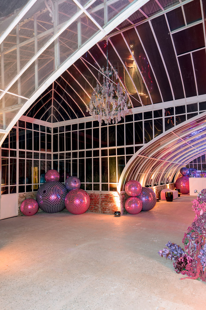 Person holding a large pink disco ball by a pool with palm trees in the background